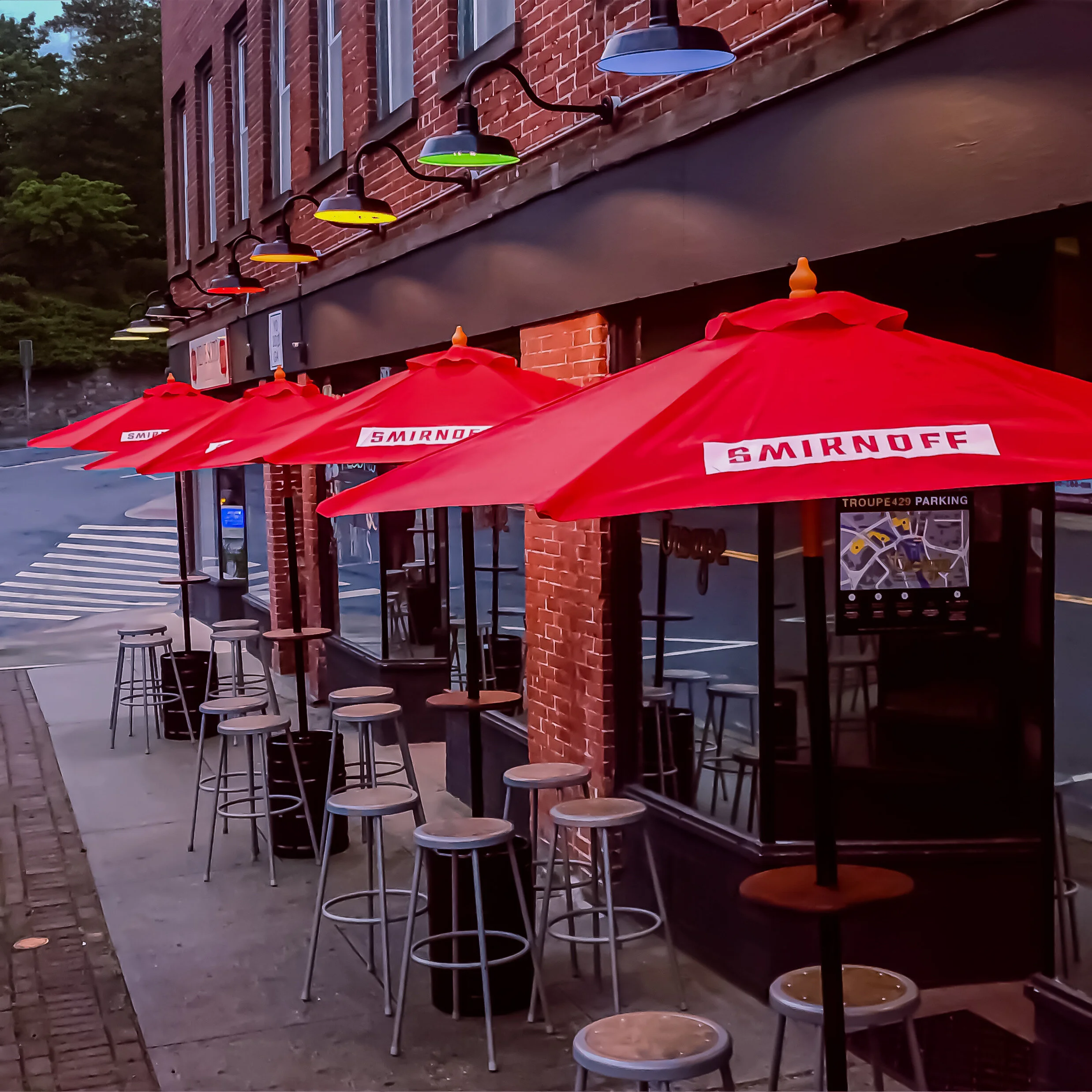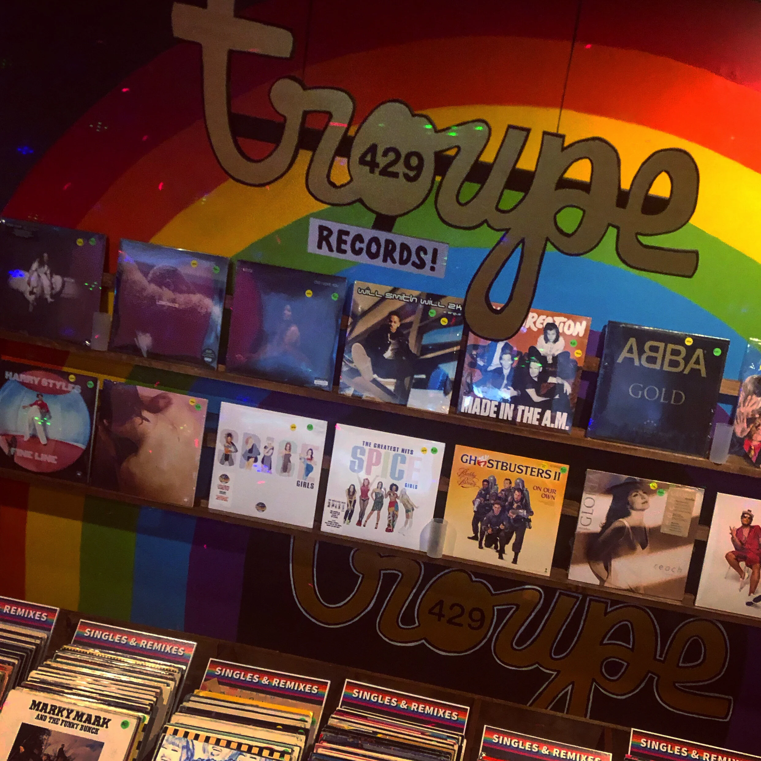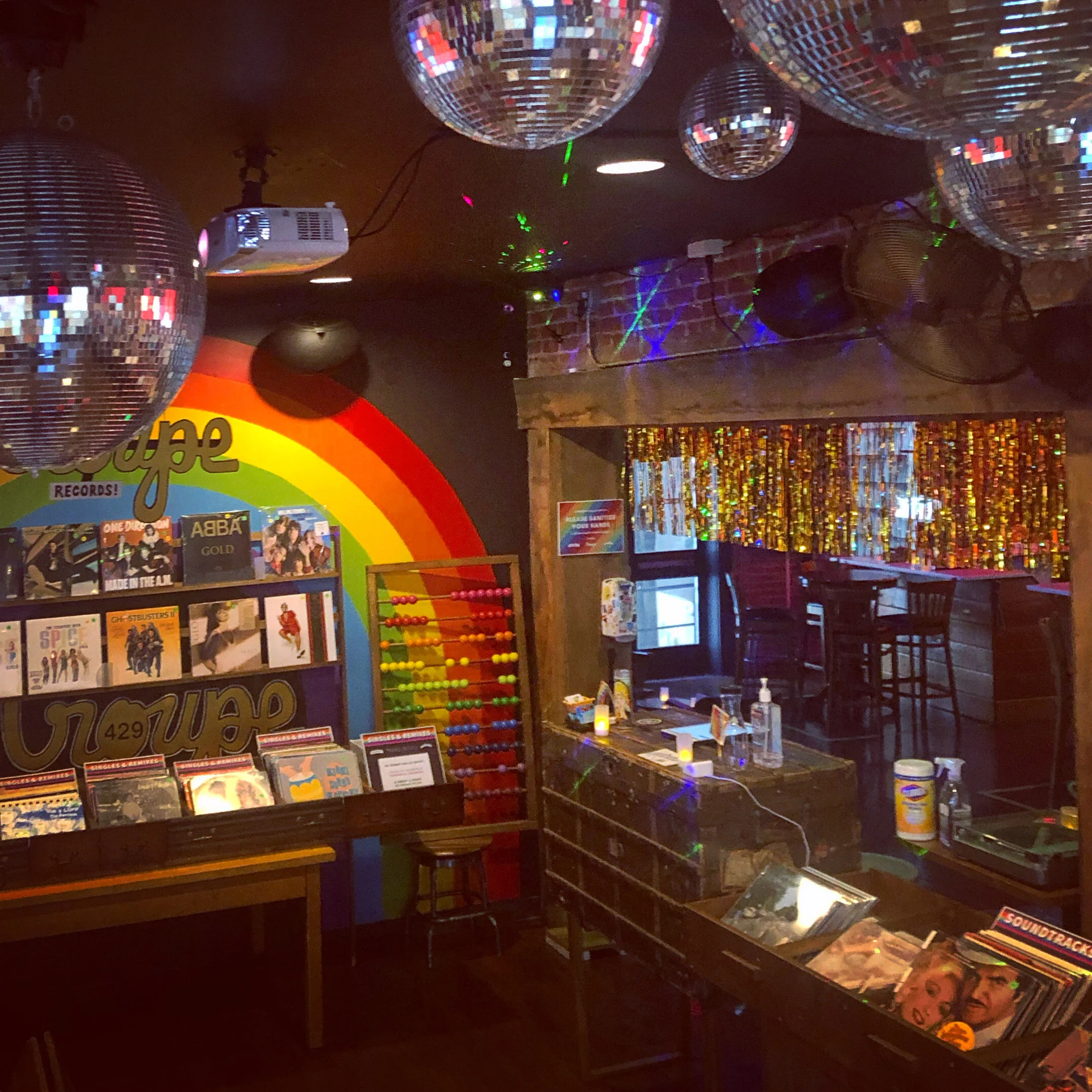 Due to the COVID-19 pandemic, I thought to repurpose the Troupe429 dance floor as a vinyl record store to attract new audiences (as the dance floor is unable to host notoriously fabulous events). All vinyl record racks and merchandise displays were handmade in my workshop. Much of the wood used was upcycled from donated desks & dressers. The outdoor patio umbrella stands were up cycled from 1/2 Keg Barrels & 2 3/8” steel fence posts. The round wood table tops were purchased at Lowes & hole cut, sanded, stained, & sealed in my workshop. A local welder welded the pole to the kegs & added a welded flat plate to the pole to secure the table tops.
